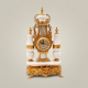 Every element of this set is handcrafted by skilled Egyptian artisans working in the tradition of European ormolu craftsmanship. The structural brass components — from the elaborate lyre frame and acanthus scroll mounts to the scrolled claw feet of the base — are precision cast and then hand-finished to a luminous polish. White marble cylinders, shaped and fitted with gilt-brass banding rings, form the columnar shafts of the candelabra and the side pillars of the clock. The clock base itself sits on a richly worked gilt-brass plinth decorated with rosette and festoon reliefs, raised on four scroll feet. A quartz movement powers the clock, housed within a circular gilt-brass bezel fitted with an ornate dial featuring Arabic numerals on a gilded ground. The candelabra bases mirror the clock plinth in their ornamental vocabulary, ensuring perfect visual coherence across the set.