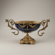 The bowl is hand-formed ceramic with a navy glaze and a hand-painted interior scene. The mounts, handles, and base are cast brass with an antique gold finish, hand-finished after casting.