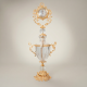 At its heart, this clock is a dialogue between two noble materials: hand-blown and faceted crystal glass and hand-cast brass finished in rich gold. The urn-form body, a silhouette lifted directly from Sèvres and Baccarat Rococo traditions, is adorned with twin acanthus-scroll brass handles that sweep outward with organic elegance — each one individually cast and hand-finished to preserve the fluidity of the scroll. The brass collar separating the urn from the crystal finial above is precisely fitted, gilded to catch candlelight and LED alike. The clock crown — an asymmetrical acanthus rocaille cartouche rendered entirely in pierced and chased brass — frames a white Roman-numeral quartz dial with red and gold hands. The lobed acanthus base, wide at 26 cm, provides a stable, architecturally resolved foundation. Every brass element is handcrafted in our Cairo atelier, maintaining the meticulous casting and finishing techniques of European ormolu tradition.