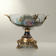 Crafted from fine-quality porcelain, the bowl's exterior showcases vibrant hand-painted artwork with a glossy glaze finish that preserves every brushstroke. The pedestal stem is finished in deep cobalt navy with hand-applied gold scroll motifs, seamlessly transitioning into a heavily ornate brass base adorned with Rococo-inspired relief carvings, foliate scrolls, and claw feet. The combination of porcelain and premium brass creates a piece of remarkable tactile and visual luxury — entirely handcrafted by skilled Egyptian artisans at Brass & Wood.