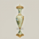 The vase body is crafted from high-quality ceramic with a hand-applied celadon glaze and hand-painted decorative cartouches. The mounts — including the collar, handles, base, and lid finial — are crafted from brass, available in multiple finish variants.