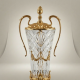 Few decorative objects command a room with the quiet authority of a classical urn. This lidded crystal urn vase draws its lineage from the grand tradition of Neoclassical and Empire-era decorative arts — the same vocabulary of elegance that graced the salons of Napoleon's Paris and the palatial interiors of early 19th-century Europe. Tall, trumpet-shaped, and wrapped in the brilliance of hand-cut crystal, it rises from an ornate brass pedestal with the composed confidence of a museum treasure brought into daily life.