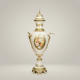 From the grand tradition of European decorative arts, this magnificent lidded urn vase draws direct inspiration from the celebrated Sèvres porcelain manufactory — France's royal atelier that defined aristocratic taste throughout the Neoclassical era. The vessel's tall, amphora-like silhouette, tapered neck, and domed finial-topped lid are all hallmarks of the 18th-century Sèvres grand vase de garniture style, pieces designed to command the mantelpieces and console tables of the most illustrious European courts. Set against a creamy ivory ground, a gilded cartouche frames a richly painted floral bouquet — peonies, roses, and mixed blooms rendered with botanical precision — evoking the celebrated floral panels that made Sèvres the envy of every European royal house.
