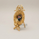 The frame and stand are crafted from solid cast brass, available in Gold, Silver, or Antique Gold finish. The central medallion is a hand-painted ceramic insert with a black ground and polychrome floral motif.