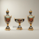 Rococo Hand-Painted Cobalt Ceramic Garniture Set with Brass Mounts – Floral Medallion Urns & Coupe