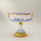 Few moments in decorative arts history rival the opulence that radiated from the Manufacture de Sèvres during the reign of Louis XV. This handcrafted 3-piece ceramic set — comprising two majestic lidded urns and a graceful centrepiece tazza — faithfully captures the spirit of that golden era. Delicate hand-painted pastoral vignettes unfold across the body of each piece: elegant courtly figures promenading beneath cerulean skies, lush foliage rendered in soft greens, and impressionistic blue chrysanthemum blooms that drift across a luminous ivory ground. The composition breathes with the lightness and romance that defined the Rococo sensibility — a world where nature, leisure, and aristocratic refinement intertwined.