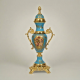 Weighing 4 kg, this urn possesses the satisfying physical presence that distinguishes a genuine decorative statement from a lightweight ornament. The full-height silhouette — from the scrolled brass feet of the plinth base to the tip of the finial — creates an imposing vertical composition ideally suited to console tables, mantlepieces, library shelving, or as an anchoring element in a formal reception. The turquoise ground is enriched with gold foliate tracery that threads between the painted panels, connecting the hand-painted medallion to the broader decorative field in a manner consistent with the finest Rococo compositional logic.