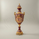 The bodies are crafted from high-fired ceramic with a hand-applied wine-red ground glaze and hand-painted medallion panels. The handles, base mounts, and decorative gallery are cast brass, hand-finished in your choice of Gold, Antique Gold, or Silver tone.