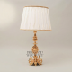 The lamp base is made from solid cast brass with a hand-polished finish. The shade is crafted from pleated fabric with a decorative gold braid trim.