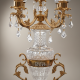 This candelabra table lamp is constructed from hand-cut crystal, precision-cast brass, and mouth-blown etched glass hurricane shades. All metal components are solid brass, hand-finished for a rich warm tone.