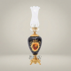 Inspired by the grandeur of 19th-century Victorian and French Empire interiors, this exquisite handcrafted table lamp is a tribute to classical European artistry. The deep cobalt ceramic vase body features a central hand-painted medallion — in one variant depicting a serene pastoral landscape, and in another a bouquet of blooming flowers — framed by intricate golden arabesques and lattice motifs. The lamp's silhouette draws from the timeless oil lamp form, evoking the elegance of candlelit salons and aristocratic drawing rooms.