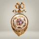 There are objects that do not merely decorate a wall — they command it. This Rococo brass wall medallion, faithfully inspired by the opulent decorative vocabulary of eighteenth-century French ateliers, presents itself as a miniature world of gilded scrollwork, hand-painted porcelain, and sculptural brass in perfect dialogue. The layered composition draws the eye through a cascading ribbon-bow crest at the crown, sweeping acanthus-and-rocaille scrolls across the circular frame, and finally settling on the luminous ceramic centrepiece, where roses, delphinium, and mixed blooms are rendered with the soft naturalism of Sèvres-inspired painted porcelain. In the Rococo tradition of the Louis XV period, every line curves, every surface celebrates ornament, and the boundary between furniture and fine art dissolves entirely.