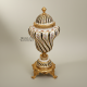 Heavily ornate Baroque ceramic & brass lidded urn vase, 90×39 cm, featuring spiral-ribbed body, hand-painted floral panels, and a sculptural gilt brass base. Handcrafted in Egypt.