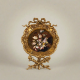 Handcrafted Rococo brass oval decorative plate on easel stand, featuring ribbon crown, rocaille cartouche frame, and botanical floral art insert — a refined accent for any luxury interior.