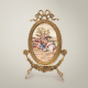 The frame and stand are cast in solid brass and finished by hand. The decorative insert shown is a hand-painted ceramic panel featuring a Rococo pastoral scene. The brass finish is available in multiple color variants including Antique Gold, Gold, and Silver.