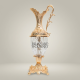 The ewer is constructed from two primary materials: hand-chased brass (upper and lower sections, handle, collar, and base) and facet-cut crystal (the central body). The brass components are finished with a high-quality plating process available in multiple colour variants.
