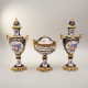 Few objects command a mantelpiece — or a collector's attention — quite like a classic garniture de cheminée. This magnificent three-piece ensemble faithfully reproduces the opulent tradition of the Royal Manufactory of Sèvres, the institution that defined luxury porcelain for the courts of Europe from the mid-eighteenth century onward. Deep cobalt blue grounds — the celebrated bleu de roi — frame hand-painted cartouches alive with rose blooms, peonies, and delicate summer botanicals, rendered with the naturalistic exuberance that characterized the finest Rococo and early Neoclassical porcelain painting. Two covered urn-form vases flank a lower lidded bowl on a pedestal foot, the classic tripartite arrangement that graced the consoles and chimneypieces of Versailles.