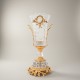 Each piece in this luxury vase set is crafted from hand-cut crystal, its surface alive with a precise geometric lattice interspersed with floral medallions — a technique requiring exceptional skill to achieve the depth and brilliance that catches and scatters light across a room. The brass hardware is cast and hand-chased to an exceptional standard: the crowning laurel-wreath motif — a quintessentially Neoclassical symbol of honor and victory — is rendered in exquisite sculptural detail, tied with a ribbon bow in the manner of Louis XVI ormolu bronzes. Scrolling foliate side handles echo the naturalistic vocabulary of the period, while the raised crystal ball stem transitions elegantly into a richly cast foliate base with bold acanthus and rocaille scrollwork, uniting Neoclassical restraint with a touch of Baroque vitality. The brass finish options — gold, antique gold, or silver — allow each garniture to complement its intended interior setting.