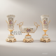 A 3-piece Rococo hand-painted porcelain vase set — two trumpet vases and a centrepiece bowl — each on an ornate gilded brass pedestal with floral bouquet medallions. Handcrafted in Egypt.