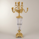 This candelabra is crafted from solid cast brass (for all structural and decorative metalwork components) and hand-engraved crystal (for the central column). The brass is finished to a high-polish sheen and available in multiple color variants.