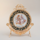 Handcrafted Rococo decorative plate featuring a hand-painted botanical floral medallion on dark green ceramic, held in an ornately scrolled brass easel stand.