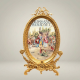 The stand is cast from solid brass and hand-finished to a luminous sheen. The oval decorative plate is crafted from ceramic, featuring a hand-applied Fête Galante painted scene.